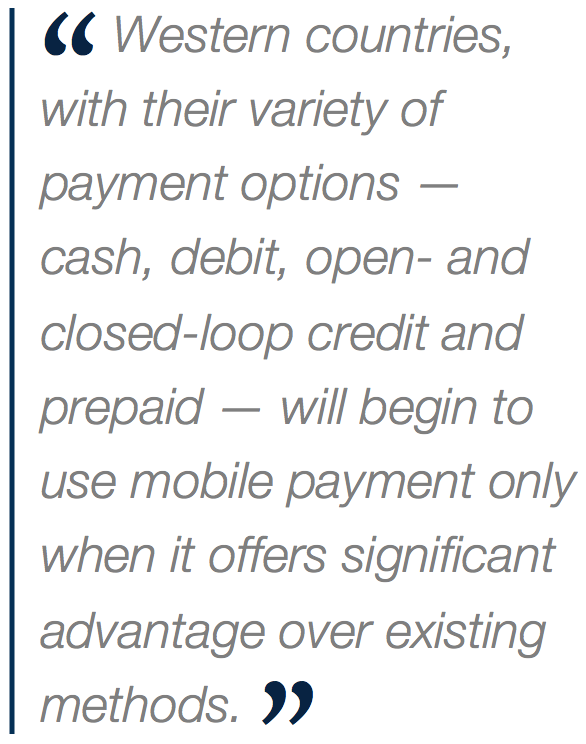 Western countries, with their variety of payment options — cash, debit, open- and closed-loop credit and prepaid — will begin to use mobile payment only when it offers significant advantage over existing methods.