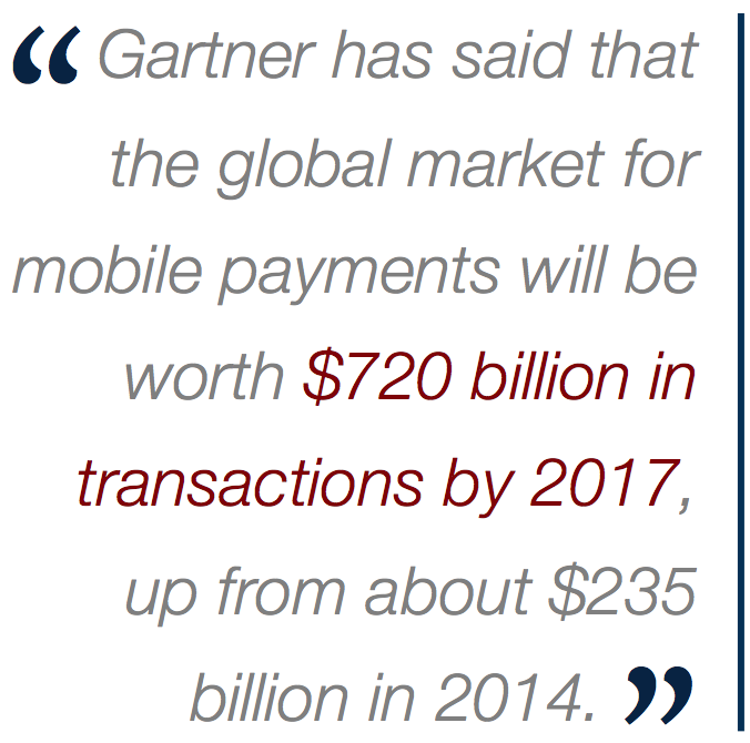 The proliferation of mobile phones worldwide naturally extends to their use for payment purposes. Gartner has said that the global market for mobile payments will be worth $720 billion in transactions by 2017, up from about $235 billion in 2014.