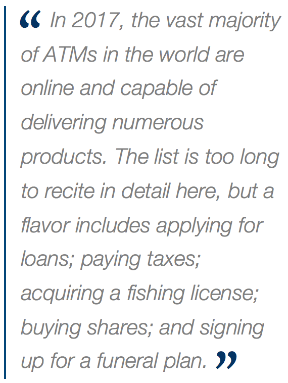 In 2017, the vast majority of ATMs in the world are online and capable of delivering numerous products.