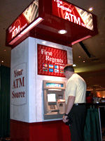 Jig (saw) is up: First Regents Bancservices is introducing several new ATM enclosures, several of which are awaiting patents, said Sebastian Abbott, the company's operations director. Perhaps the most unique feature, Abbot said, is a design which fits together like a jigsaw puzzle, making structural repairs easy and cheap. The 4838, which was in the First Regents booth, stands 8 feet tall and sells for about $8,000.