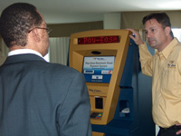 Dean Scaros, president and CEO of Pay-Ease, shows off the Pay-Ease V Series, a multi-functional bill-payment kiosk. |