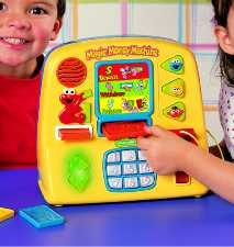 The Sesame Street Money Machine manufactured by Fisher-Price is designed for even smaller fry. The preschool set can deposit or withdraw "money" by pressing a light-up dollar sign; a number pad calls out each numeral when it is pressed, so kids can count along with Big Bird, Cookie Monster or Elmo.